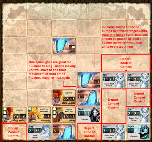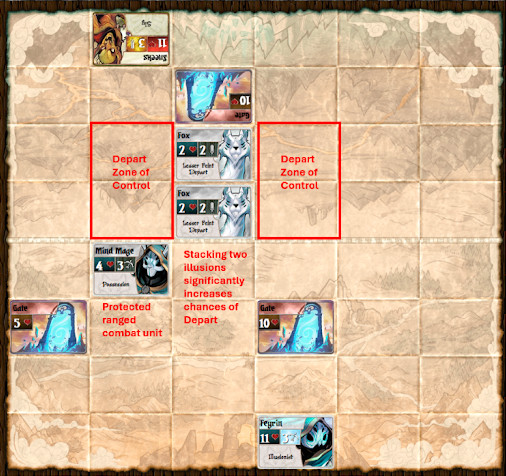 1. Stagger your gates and illusions. This means if you have a gate at B3, your next gate should be two over and one up/down (so D2 or D4). Not only does this optimize your summoning spots, but you'll be able to use Hawk to remove blocking units attempting to clog you. Staggering illusions also maximizes your area control and chances of triggering 'Depart'!