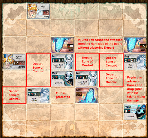 2. Do your best to leave 2 empty spaces between Feyrin (or any unit for that matter) and an illusion. This prevents a ranged unit from walking up, departing your blocker, then getting a shot in on the unit behind the illusion - since that unit will be out of reach.