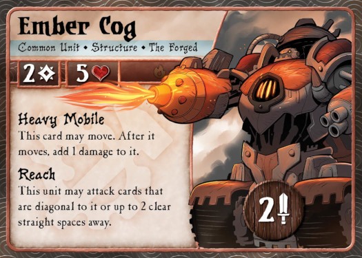The Ember Cog serves as both a tank and a versatile tool. Its diagonal attack provides multiple avenues of offense, making it hard for opponents to create effective blocks or gates. With solid health and consistent damage, it’s generally the safest unit to summon. Combined with the Inventor, its diagonal attack allows for significant pressure on the opponent's summoner. Opponents must maintain perfect horizontal placement to stop it, but The Forged is adept at breaking through defenses to create new opportunities.